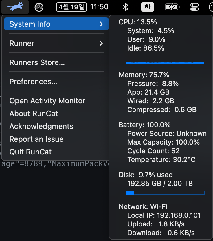 예를 들어, 제가 사용하는 어플 중에 고양이가 뛰어다니는 "RunCat"이라는 어플이 있는데,