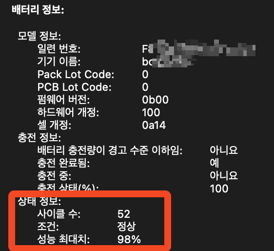 맥북의 설정에서 확인하는 성능 최대치는 98프로였는데,