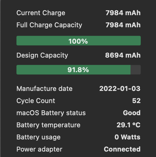 빅서부터는 (정확히는 애플실리콘 출시 이후 인것 같다) 배터리의 "최대 충전 용량"이 나오지 않는다.