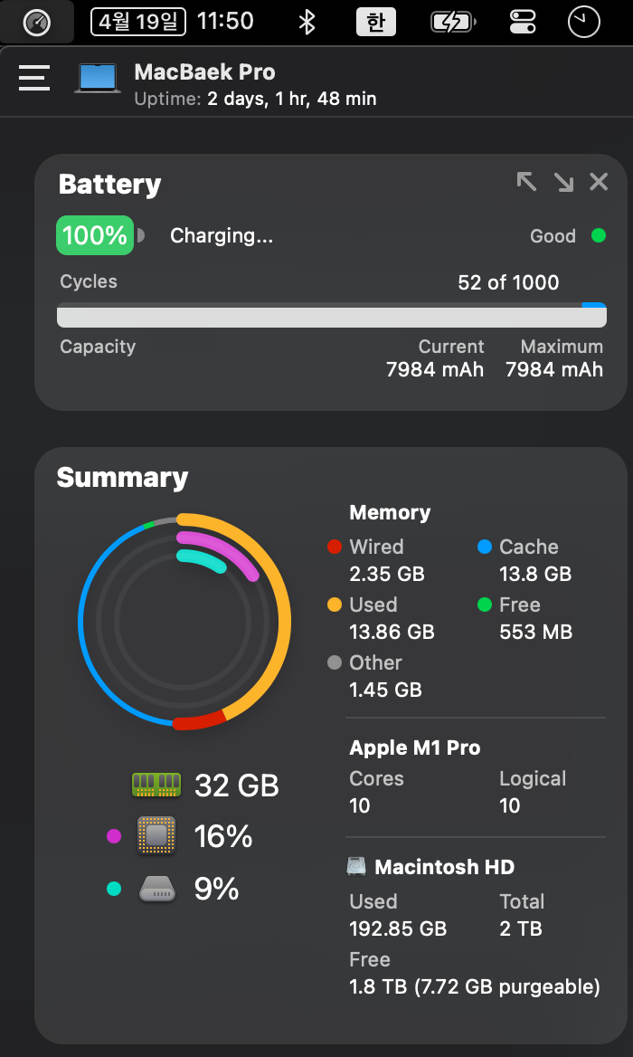흔히 맥북 상태를 확인하는 앱중 하나인 'istatica'입니다.